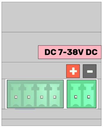 Zasilanie konwertera MODIG RS485-ETHERNET DIN polega na doprowadzeniu napięcia stałego do złącza oznaczonego DC 7-38V. Jest to złącze typu Phoenix Contact MC 3,81 mm z dwoma stykami. Źródło zasilania musi dostarczać napięcie z zakresu 6…38 V DC i min. 0,2 A. Należy zwrócić uwagę na właściwą polaryzację.
